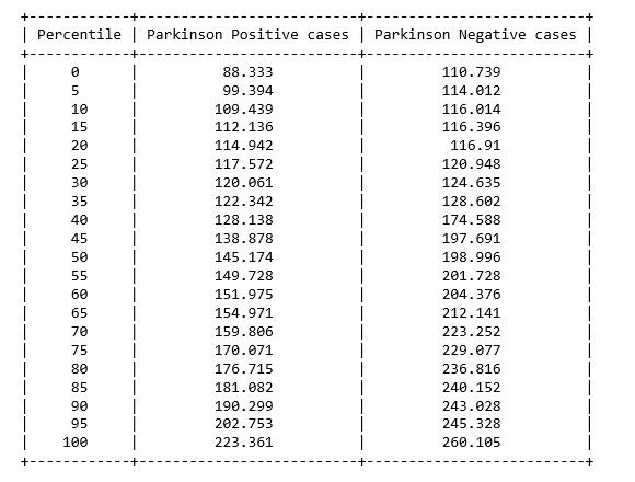 figure 3: Percentile table of Average vocal fundamental frequency per Parkinson positive and Parkinson Negative cases