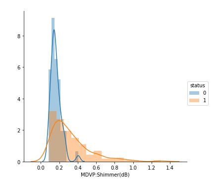 figure 10:Distribution plot with histogram showing the Shimmer values Parkinson affected cases