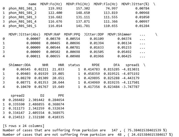 The data set which is used for the analysis is created by Max Little of the University of Oxford, in collaboration with the National Centre for Voice and Speech, Denver, Colorado, who recorded the speech signals. This dataset consists of a range of biomedical voice measurements with 195 samples of cases. The dataset consist of 24 attributes which are name of patients, three types of fundamental frequencies(high, low and average),several measures of variation in fundamental frequency (jitter and its type),several measures of variation in amplitude(shimmer and its type),Two measures of ratio of noise to tonal components in the voice(NHR and HNR),status(0 for healthy and 1 for Parkinson positive case), Two nonlinear dynamical complexity measures(RPDE,D2), DFA a signal fractal scaling exponent and Three nonlinear measures of fundamental frequency variation (spread1,spread2,PPE) [1]. The data set has about 75% of cases suffering from Parkinson disease and 25% of cases which are healthy.
