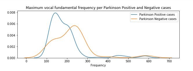 figure 5:Distribution plot of Maximum vocal fundamental frequency per Parkinson positive and Parkinson Negative cases