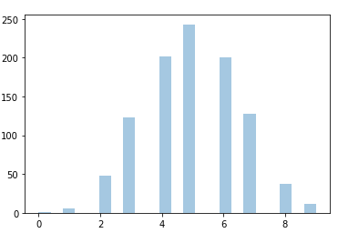 sns.distplot(np.random.binomial(n=10, p=0.5, size=1000), hist=True, kde= False)binom.pmf() calculates the probability of having exactly k heads out of n coin flips.
